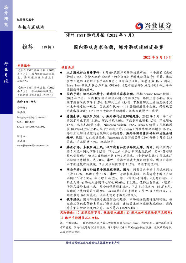【兴业证券】【20220810】海外TMT游戏月报(2022年7月):国内游戏需求企稳,海外游戏现回暖趋势-24页