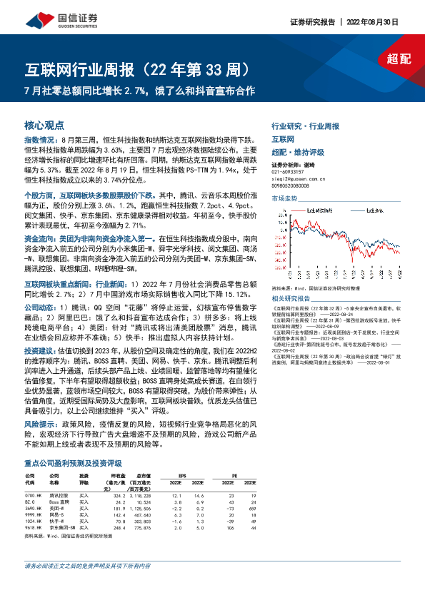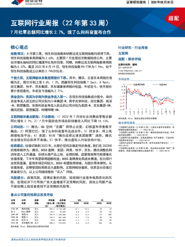 【国信证券】【20220830】20220830-国信证券-互联网行业周报(22年第33周):7月社零总额同比增长2.7%,饿了么和抖音宣布合作-12页