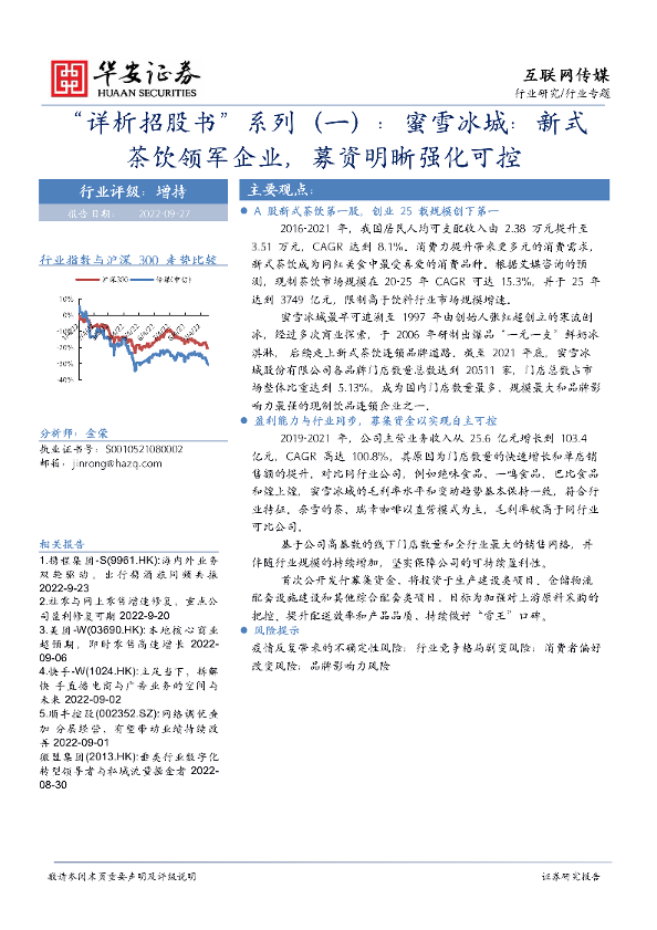 【华安证券】【20220927】“详析招股书”系列(一):蜜雪冰城:新式茶饮领军企业,募资明晰强化可控-14页