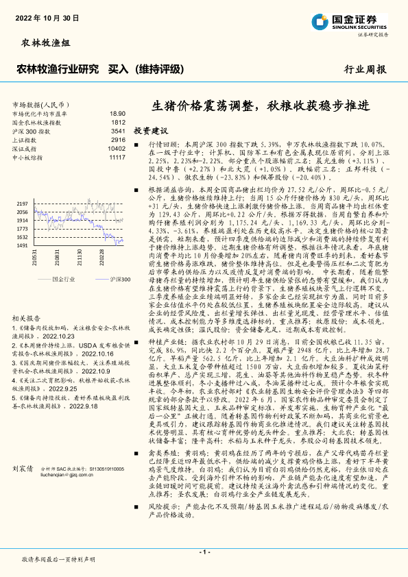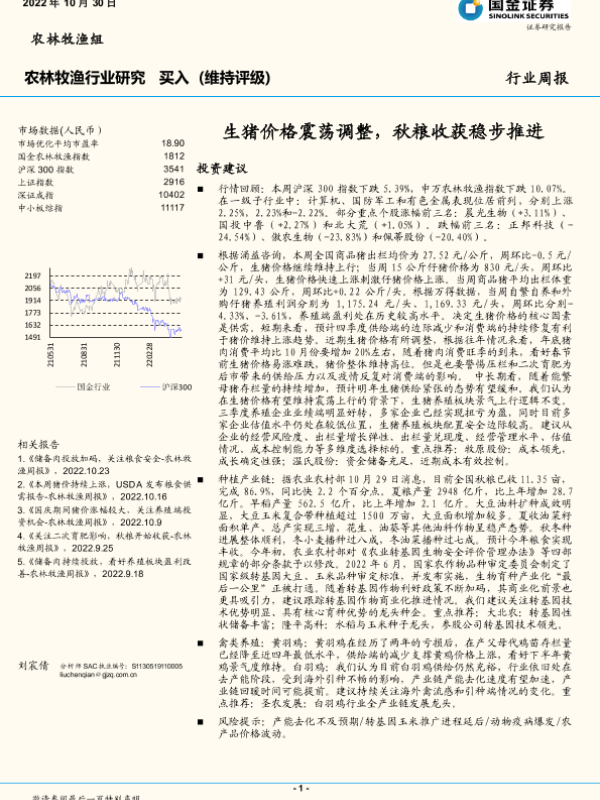 【国金证券】【20221030】农林牧渔行业研究:生猪价格震荡调整,秋粮收获稳步推进-16页