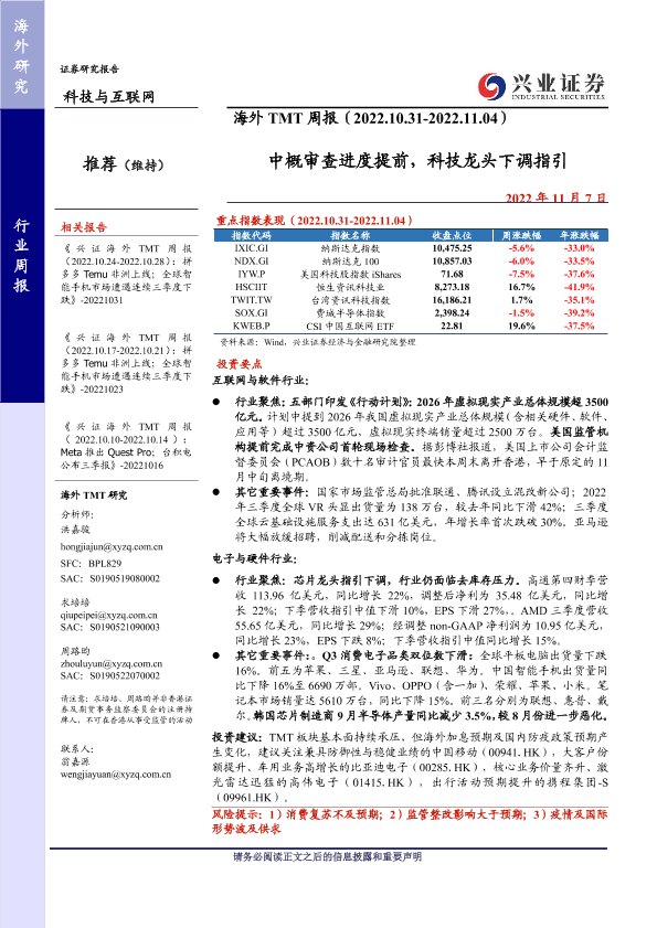 【兴业证券】【20221107】科技与互联网海外TMT周报:中概审查进度提前,科技龙头下调指引-15页