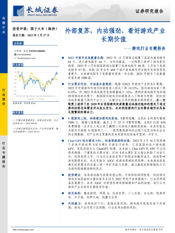 【长城证券】【20230227】20230227-长城证券-游戏行业专题报告:外部复苏,内功强劲,看好游戏产业长期价值-10页