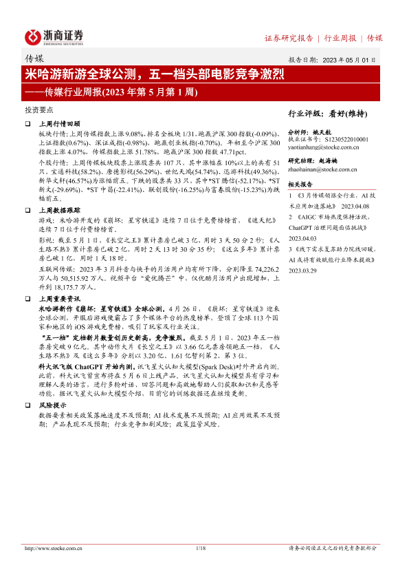 【浙商证券】【20230501】20230501-浙商证券-传媒行业周报(2023年第5月第1周):米哈游新游全球公测,五一档头部电影竞争激烈-18页