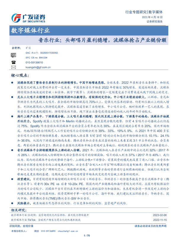 【广发证券】【20230418】音乐行业:头部唱片盈利稳增,流媒体抢占产业链份额-70页