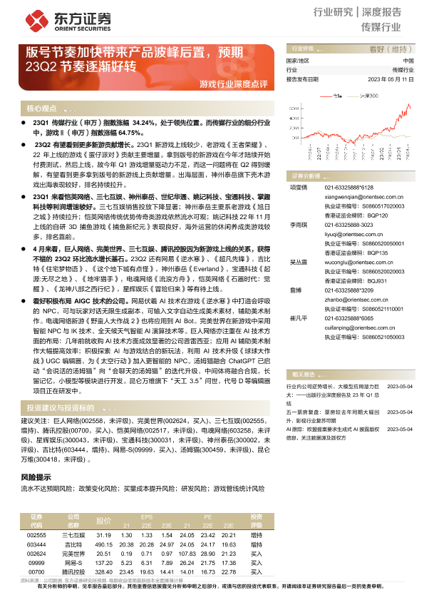 【东方证券】【20230511】20230511-东方证券-游戏行业深度点评:版号节奏加快带来产品波峰后置,预期23Q2节奏逐渐好转-22页