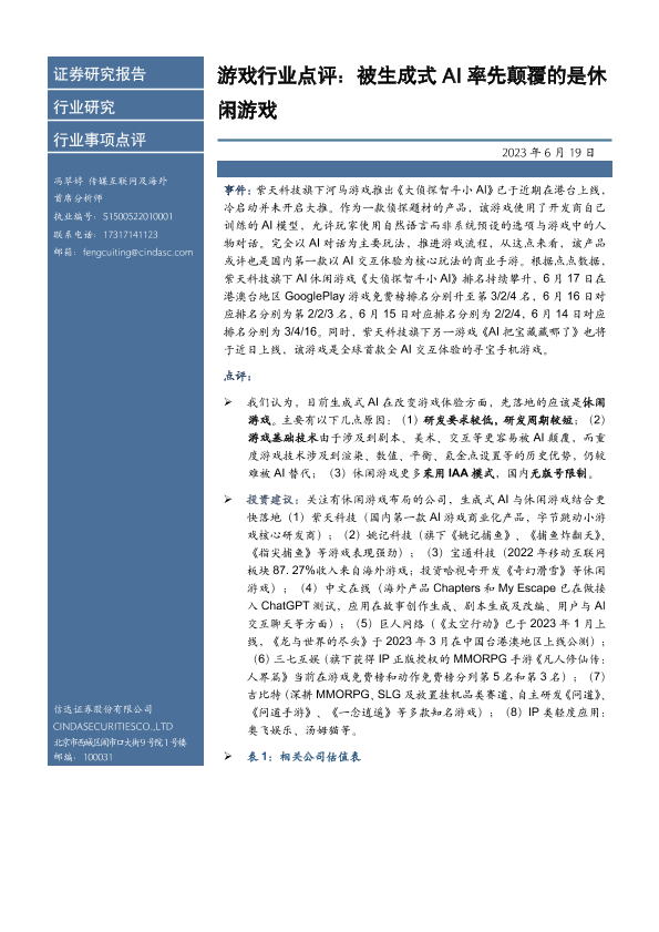 【信达证券】【20230619】游戏行业点评:被生成式AI率先颠覆的是休闲游戏-10页
