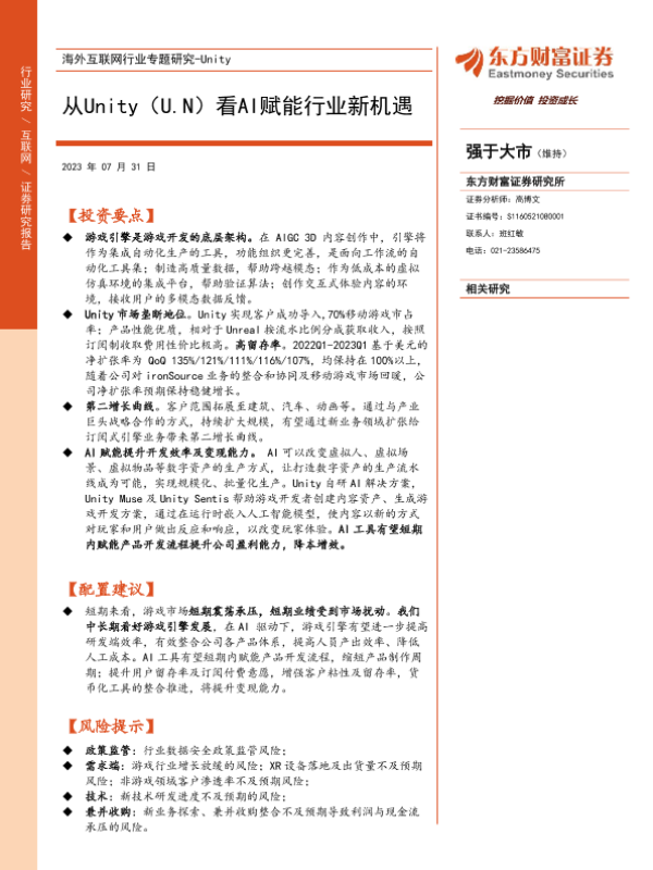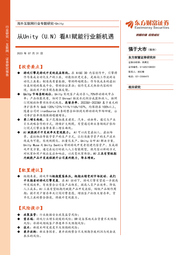【东方财富证券】【20230731】海外互联网行业专题研究-Unity:从Unity看AI赋能行业新机遇-25页