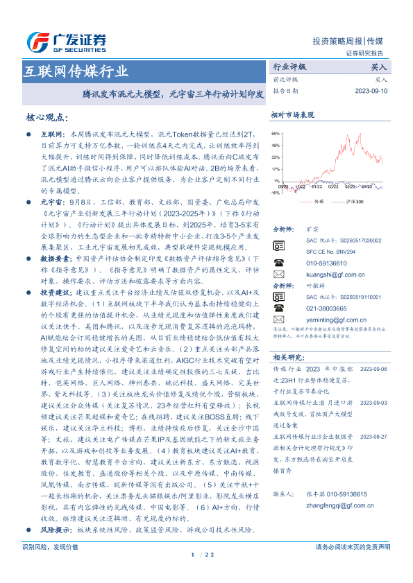 【广发证券】【20230910】互联网传媒行业:腾讯发布混元大模型,元宇宙三年行动计划印发-22页