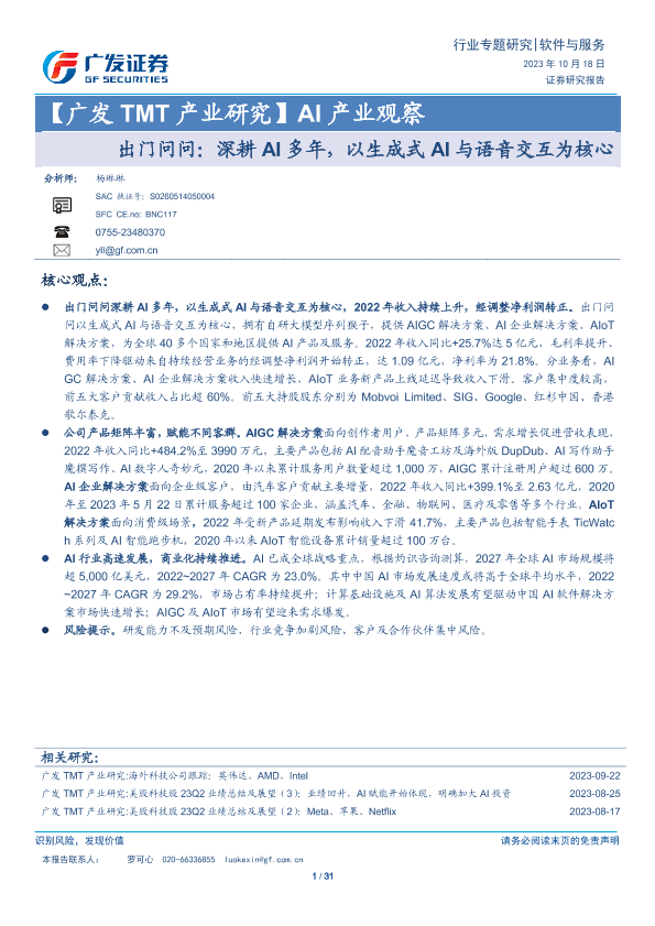 【广发证券】【20231018】AI产业观察:出门问问:深耕AI多年,以生成式AI与语音交互为核心-31页