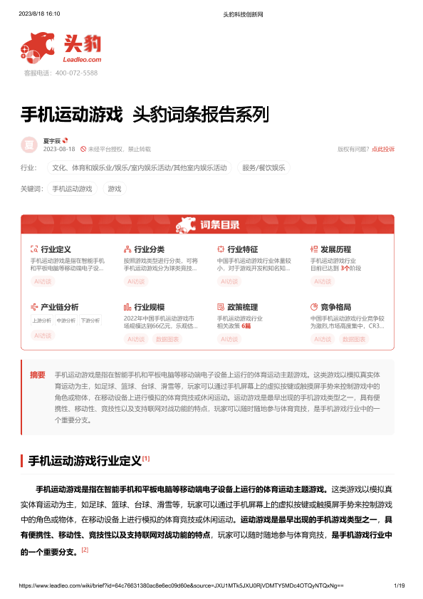 【头豹研究院】【20230818】手机运动游戏 头豹词条报告系列-19页