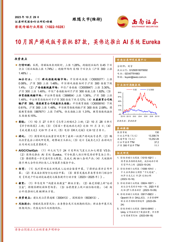 【西南证券】【20231029】20231029-西南证券-影视传媒行业周报:10月国产游戏版号获批87款,英伟达推出AI系统Eureka-20页