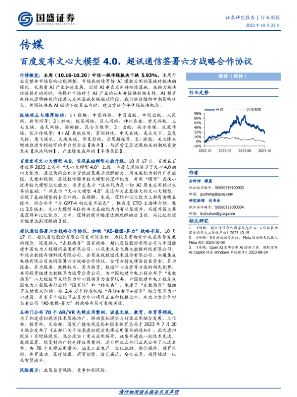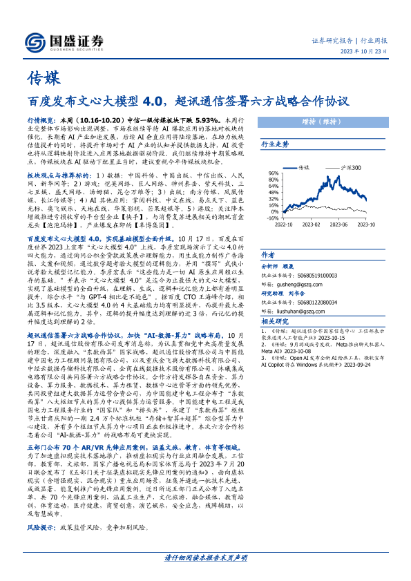 【国盛证券】【20231023】20231023-国盛证券-传媒行业周报:百度发布文心大模型4.0,超讯通信签署六方战略合作协议-10页