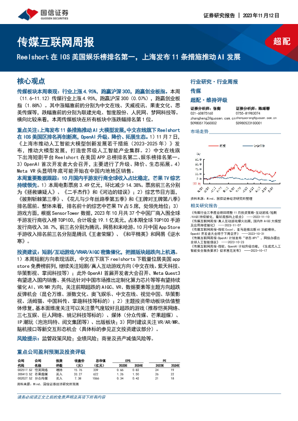 【国信证券】【20231112】20231112-国信证券-传媒互联网周报:Reelshort在IOS美国娱乐榜排名第一,上海发布11条措施推动AI发展-17页