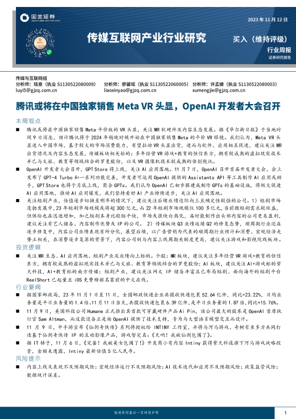 【国金证券】【20231112】传媒互联网产业行业研究:腾讯或将在中国独家销售Meta VR头显,OpenAI开发者大会召开-22页