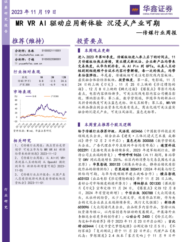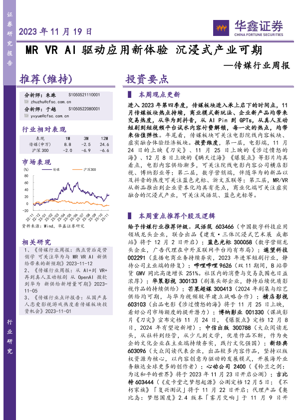 【华鑫证券】【20231119】20231119-华鑫证券-传媒行业周报:MR VR AI驱动应用新体验 沉浸式产业可期-20页