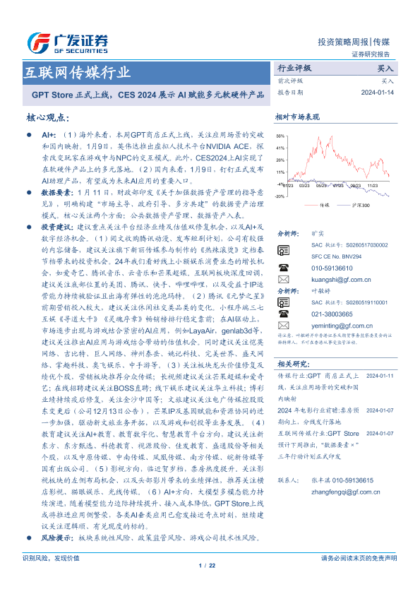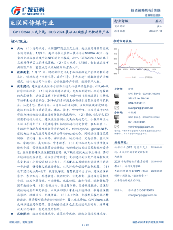 【广发证券】【20240114】20240114-广发证券-互联网传媒行业投资策略周报:GPT Store正式上线,CES 2024展示AI赋能多元软硬件产品-22页