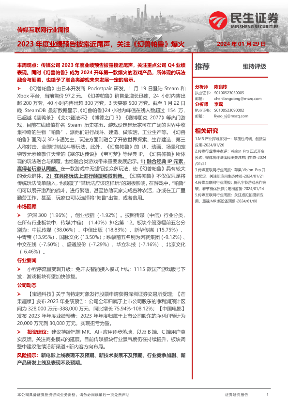 【民生证券】【20240129】20240129-民生证券-传媒互联网行业周报:2023年度业绩预告披露近尾声,关注《幻兽帕鲁》爆火-16页
