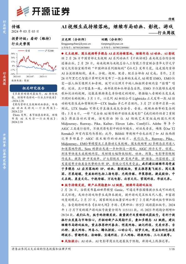 【开源证券】【20240303】20240303-开源证券-传媒行业周报:AI视频生成持续落地,继续布局动画、影视、游戏-16页