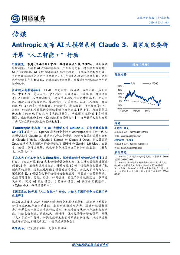 【国盛证券】【20240310】20240310-国盛证券-传媒行业周报:Anthropic发布AI大模型系列 Claude 3,国家发改委将开展“人工智能+”行动-10页
