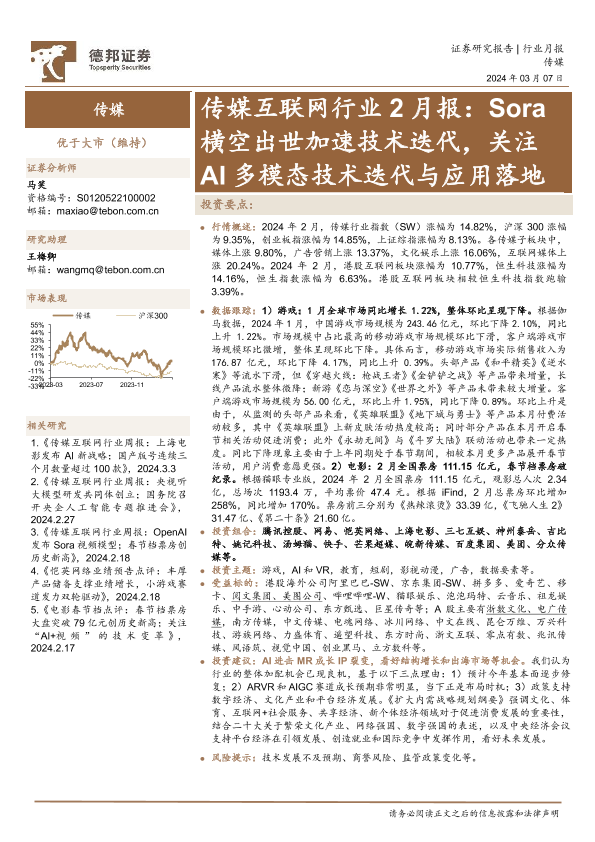 【德邦证券】【20240307】传媒互联网行业2月报:Sora横空出世加速技术迭代,关注AI多模态技术迭代与应用落地-13页