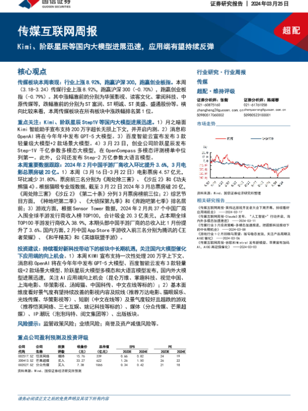 【国信证券】【20240325】20240325-国信证券-传媒互联网周报:Kimi、阶跃星辰等国内大模型进展迅速,应用端有望持续反弹-17页