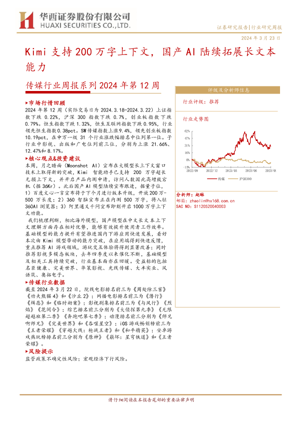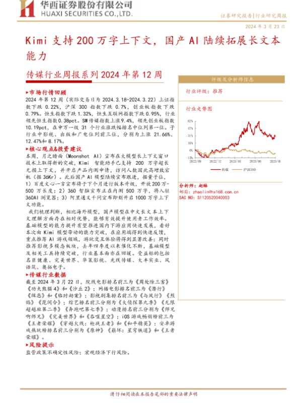 【华西证券】【20240323】2024年第12周传媒行业周报:Kimi支持200万字上下文,国产AI陆续拓展长文本能力-32页