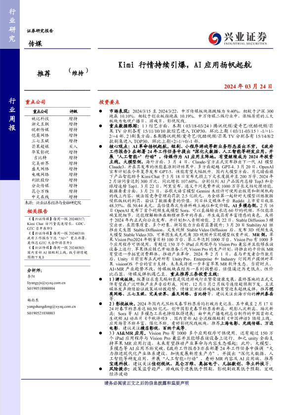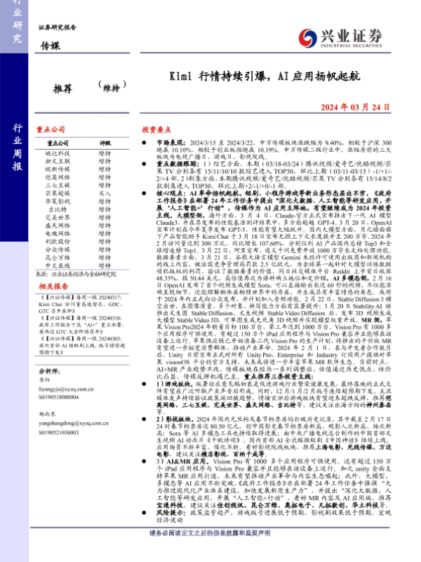 【兴业证券】【20240324】20240324-兴业证券-传媒行业周报:Kimi 行情持续引爆,AI应用扬帆起航-22页