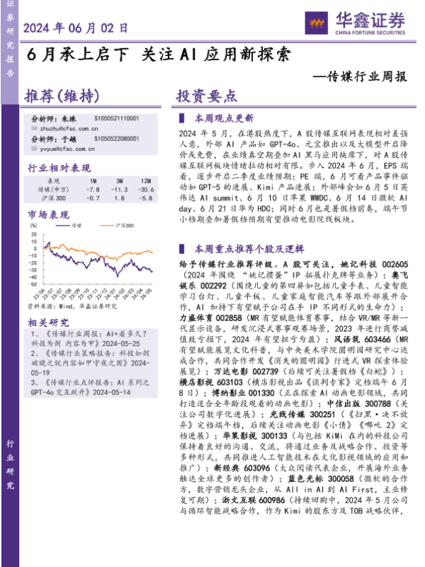AI应用 个股推荐 传媒行业 市场表现 行业周报