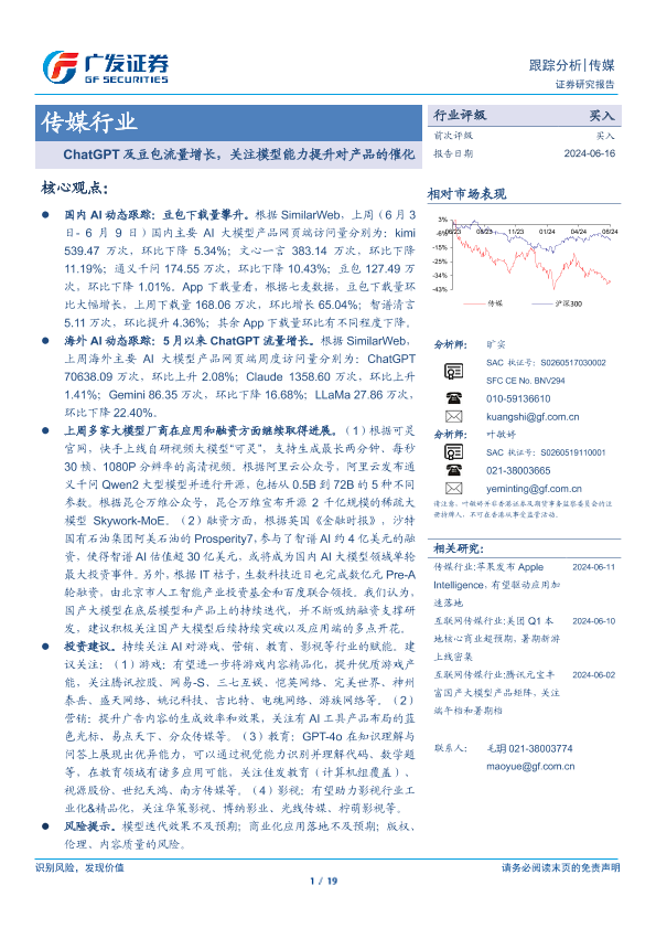 【广发证券】【20240616】ChatGPT及豆包流量增长,关注模型能力提升对产品的催化-19页