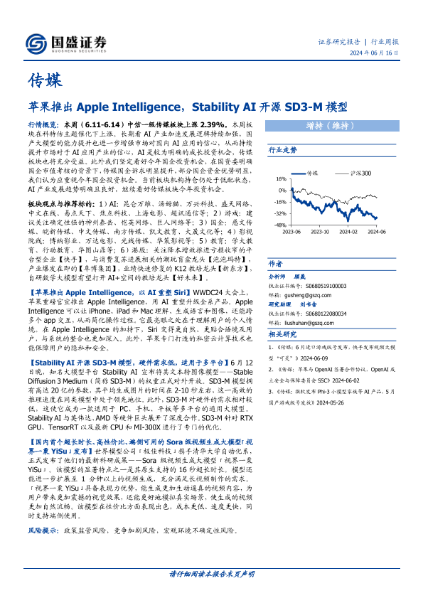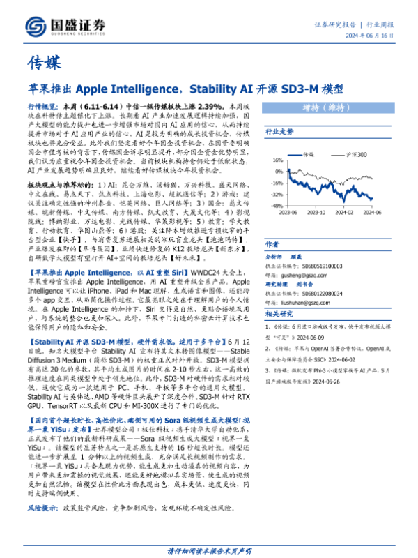 【国盛证券】【20240616】20240616-国盛证券-传媒行业周报:苹果推出Apple Intelligence,Stability AI开源SD3-M模型-10页