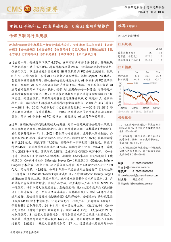 【海通证券】【20240618】传媒互联网行业周报:重视AI手机和AI PC变革的开始,C端AI应用有望推广-12页