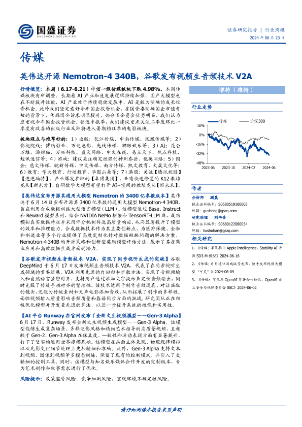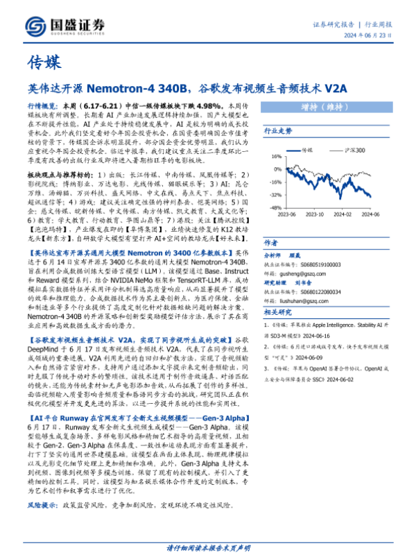 【国盛证券】【20240623】20240623-国盛证券-传媒行业周报:英伟达开源Nemotron-4 340B,谷歌发布视频生音频技术V2A-10页