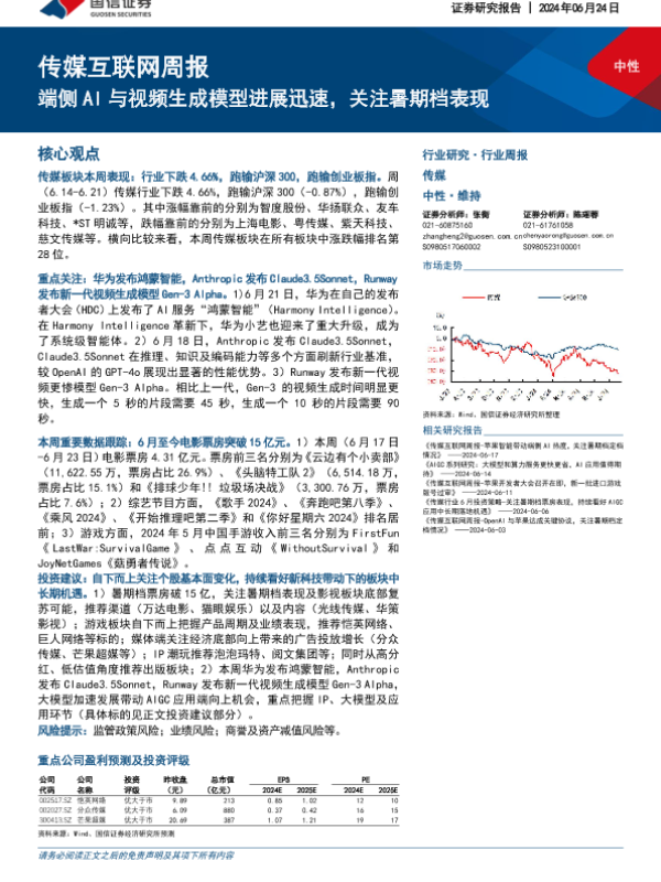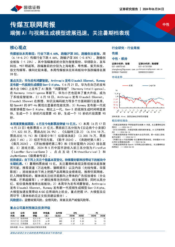 【国信证券】【20240624】20240624-国信证券-传媒互联网行业周报:端侧AI与视频生成模型进展迅速,关注暑期档表现-14页
