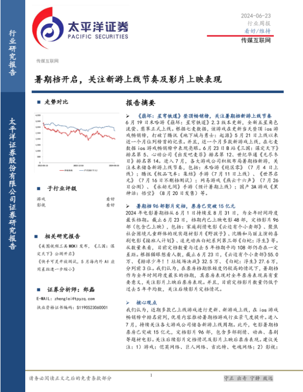 【太平洋证券】【20240623】传媒互联网行业周报:暑期档开启,关注新游上线节奏及影片上映表现-22页