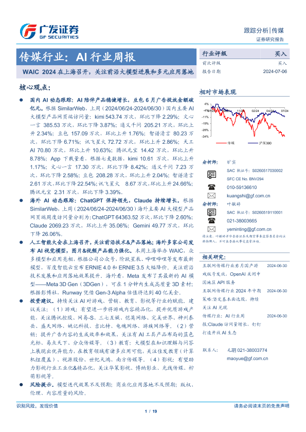 【广发证券】【20240706】AI行业周报:WAIC 2024在上海召开,关注前沿大模型进展和多元应用落地-19页