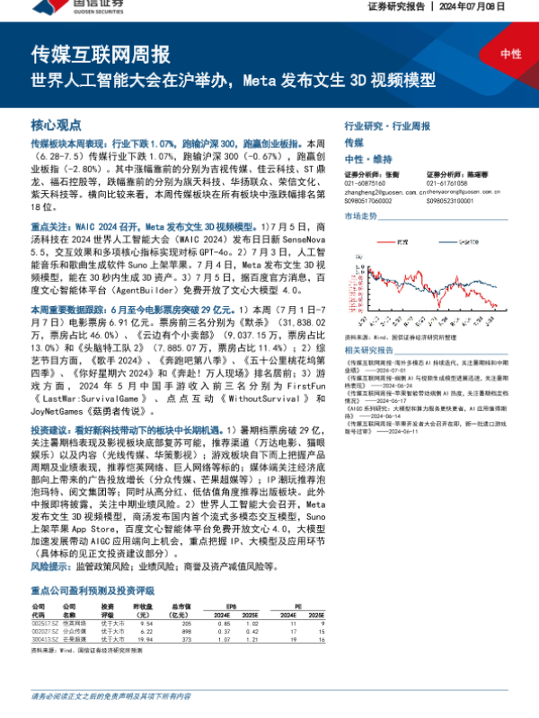 【国信证券】【20240708】20240708-国信证券-传媒互联网周报:世界人工智能大会在沪举办,Meta发布文生3D视频模型-14页