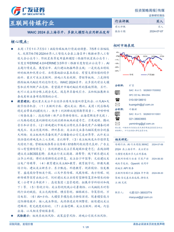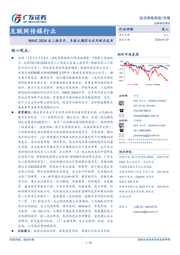 【广发证券】【20240707】互联网传媒行业投资策略周报:WAIC 2024在上海召开,多款大模型与应用新品发布-21页