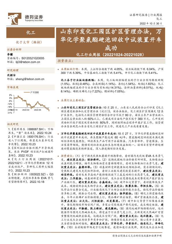 【德邦证券】【20221030】化工行业周报:山东印发化工园区扩区管理办法,万华化学聚氨酯硬泡回收中试装置开车成功-26页