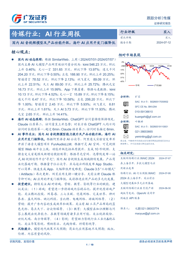 【广发证券】【20240712】AI行业周报,国内AI音视频模型及产品功能升级,海外AI应用开发门槛降低-19页