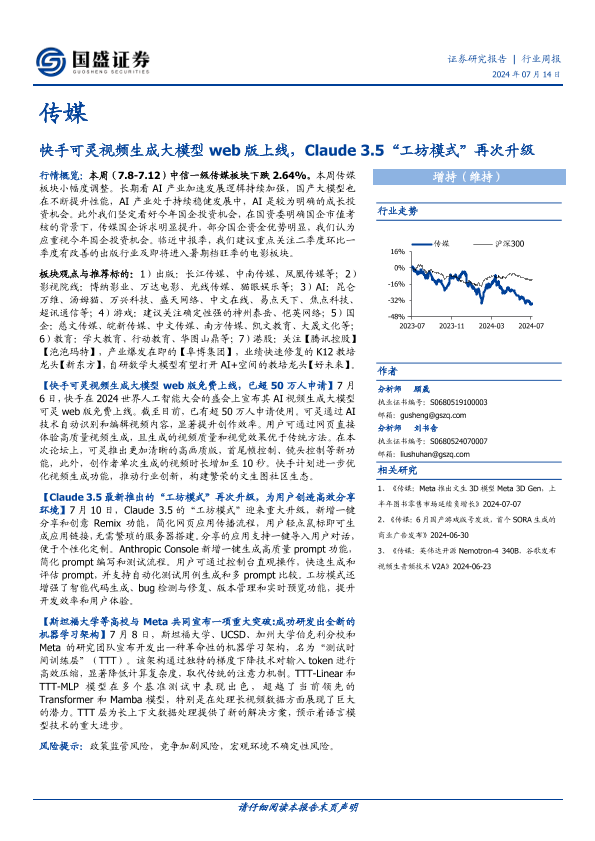 【国盛证券】【20240714】20240714-国盛证券-传媒行业周报:快手可灵视频生成大模型web版上线,Claude3.5“工坊模式”再次升级-10页