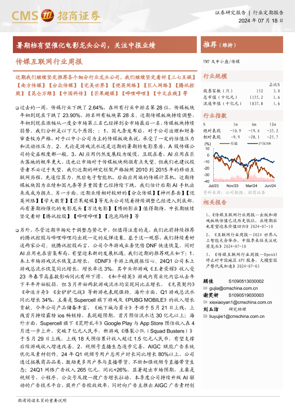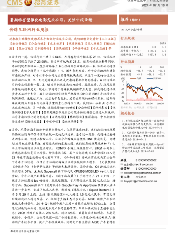 【海通证券】【20240718】20240718-招商证券-传媒互联网行业周报:暑期档有望催化电影龙头公司,关注中报业绩-12页