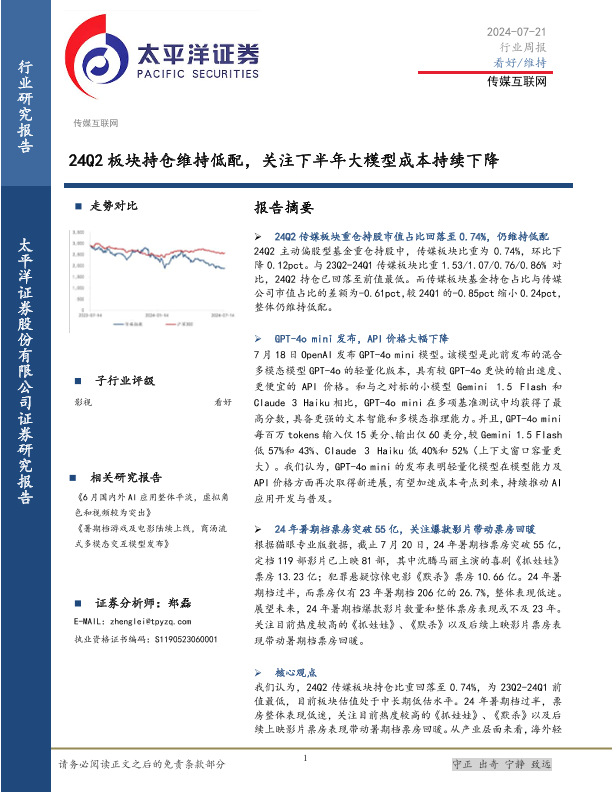 【太平洋证券】【20240721】24Q2板块持仓维持低配,关注下半年大模型成本持续下降-23页