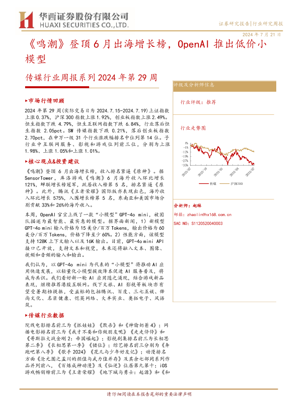 【华西证券】【20240721】2024年第29周传媒行业周报:《鸣潮》登顶6月出海增长榜,OpenAI推出低价小模型-28页