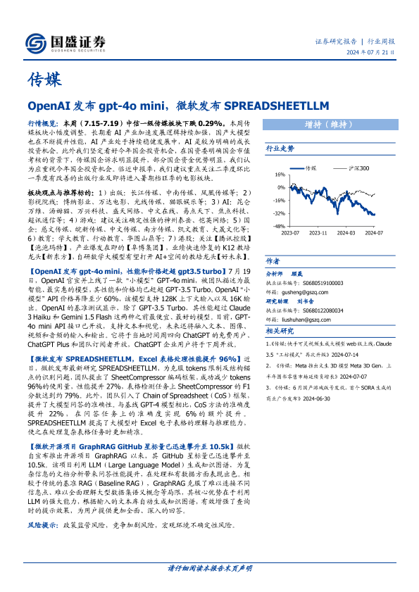 【国盛证券】【20240721】20240721-国盛证券-传媒行业周报:OpenAI发布gpt-4o mini,微软发布SPREADSHEETLLM-10页
