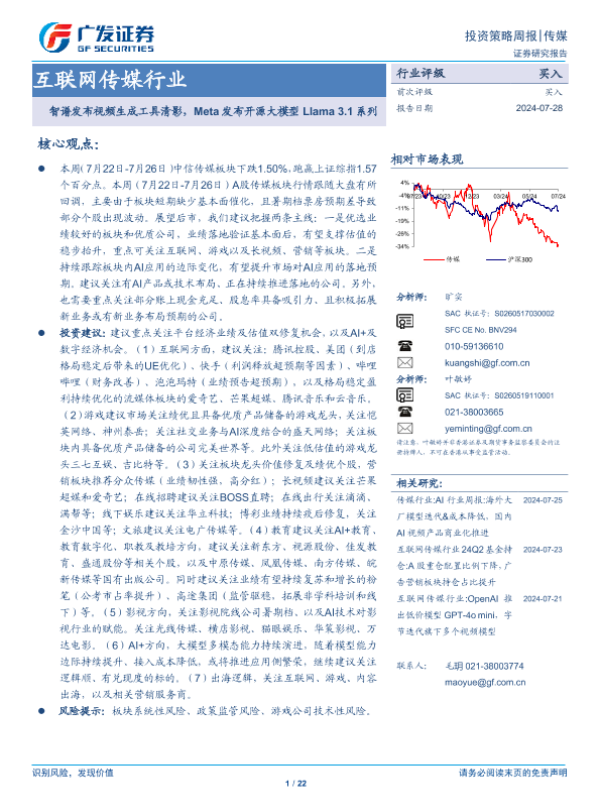 【广发证券】【20240728】互联网传媒行业投资策略周报:智谱发布视频生成工具清影,Meta发布开源大模型Llama 3.1系列-22页