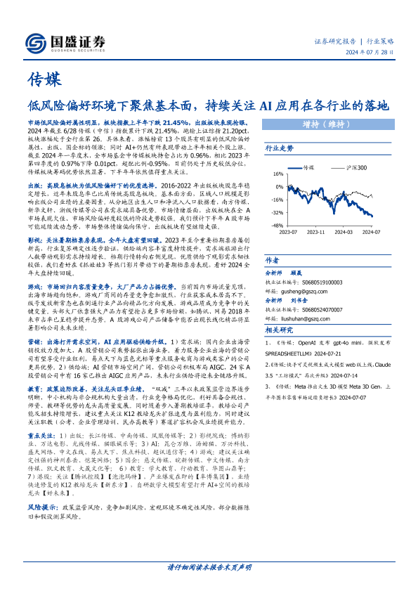 AI应用 传媒 低风险偏好 基本面 行业策略