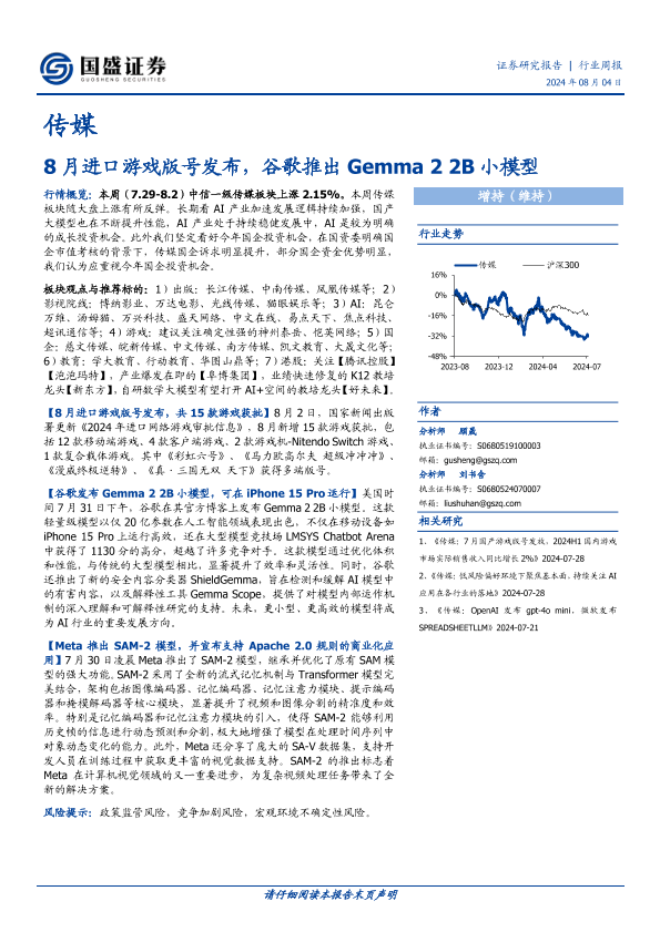 【国盛证券】【20240804】20240804-国盛证券-传媒行业周报:8月进口游戏版号发布,谷歌推出Gemma 2 2B小模型-10页
