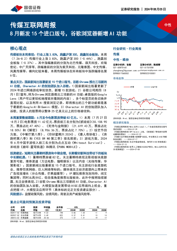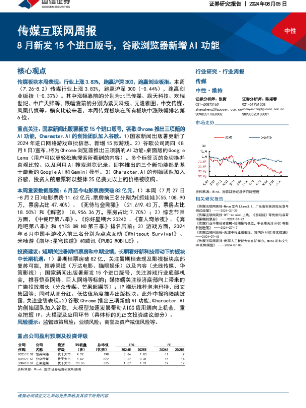 【国信证券】【20240805】20240805-国信证券-传媒互联网周报:8月新发15个进口版号,谷歌浏览器新增AI功能-15页