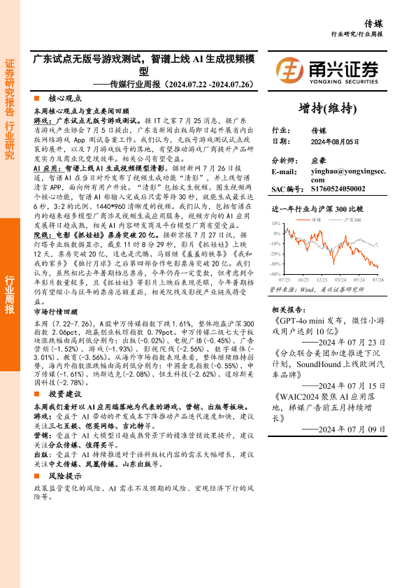【甬兴证券】【20240805】20240805-甬兴证券-传媒行业周报:广东试点无版号游戏测试,智谱上线AI生成视频模型-12页