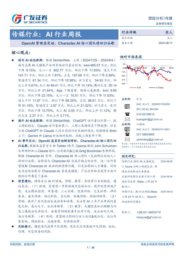 【广发证券】【20240811】AI行业周报:OpenAI管理层变动,Character.AI核心团队将回归谷歌-20页